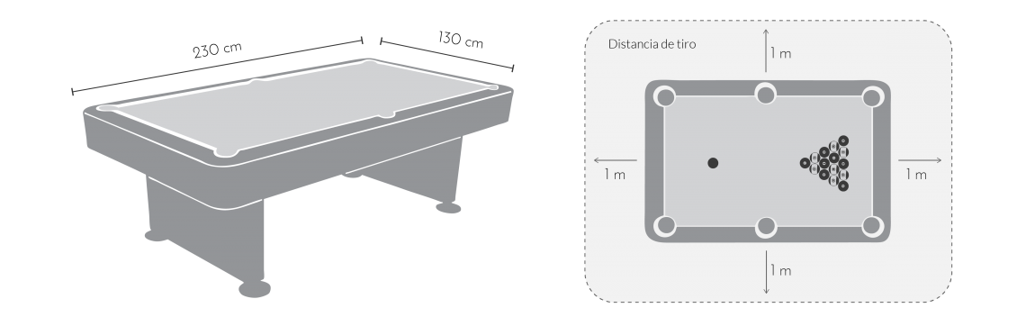 A continuación te mostramos las medidas del billar y el espacio que se necesita para que los clientes puedan jugar.